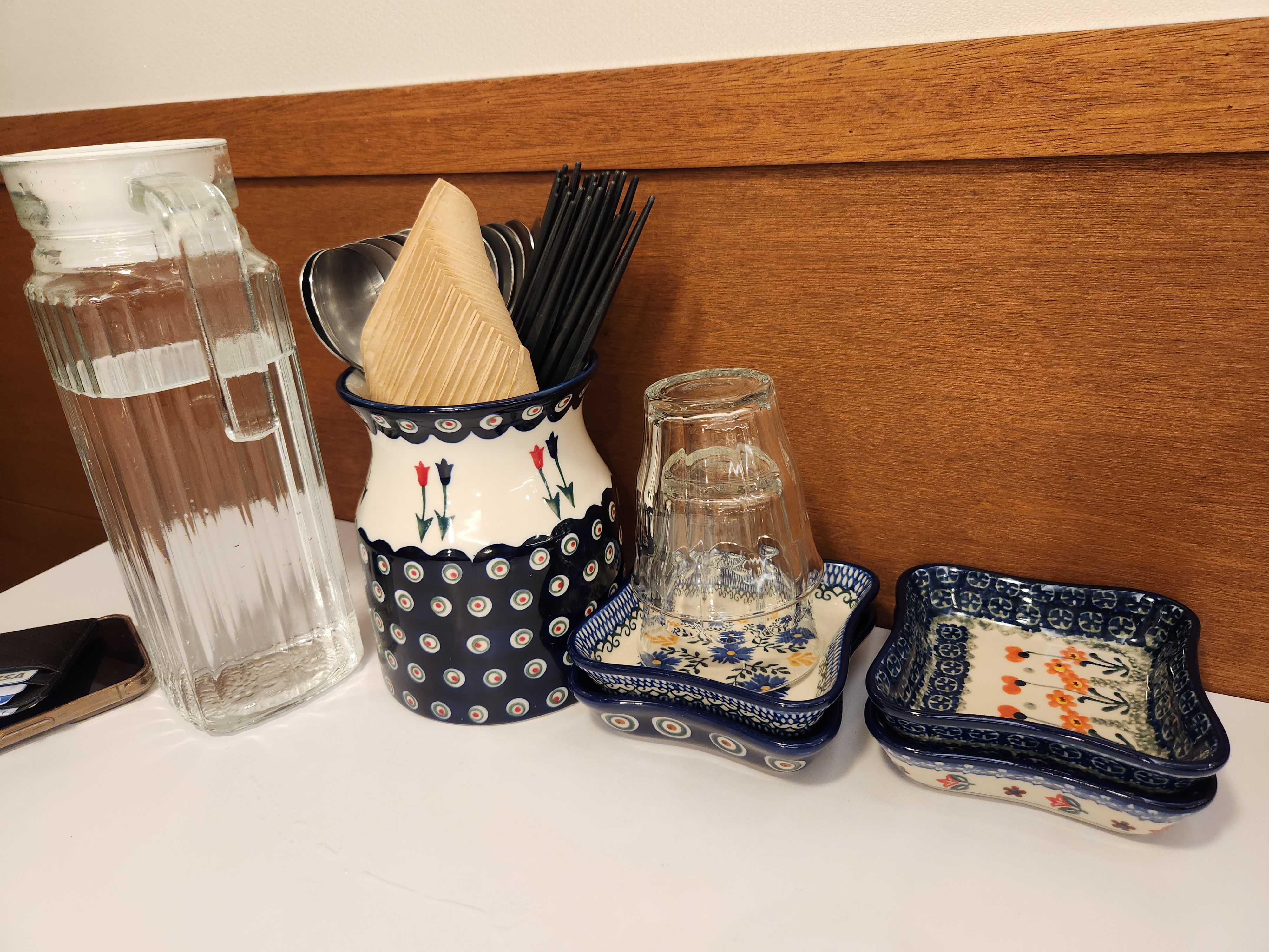 음식이 나오길 기다리면서 식당의 분위가를 살폈어요 그릇들이 비슷한 패턴의 이쁜 접시로 통일되어 있었어요 벽에도 액자 같은 장식품들이 걸려 있어서 좀 더 고급스러운 분위기를 풍겼어요