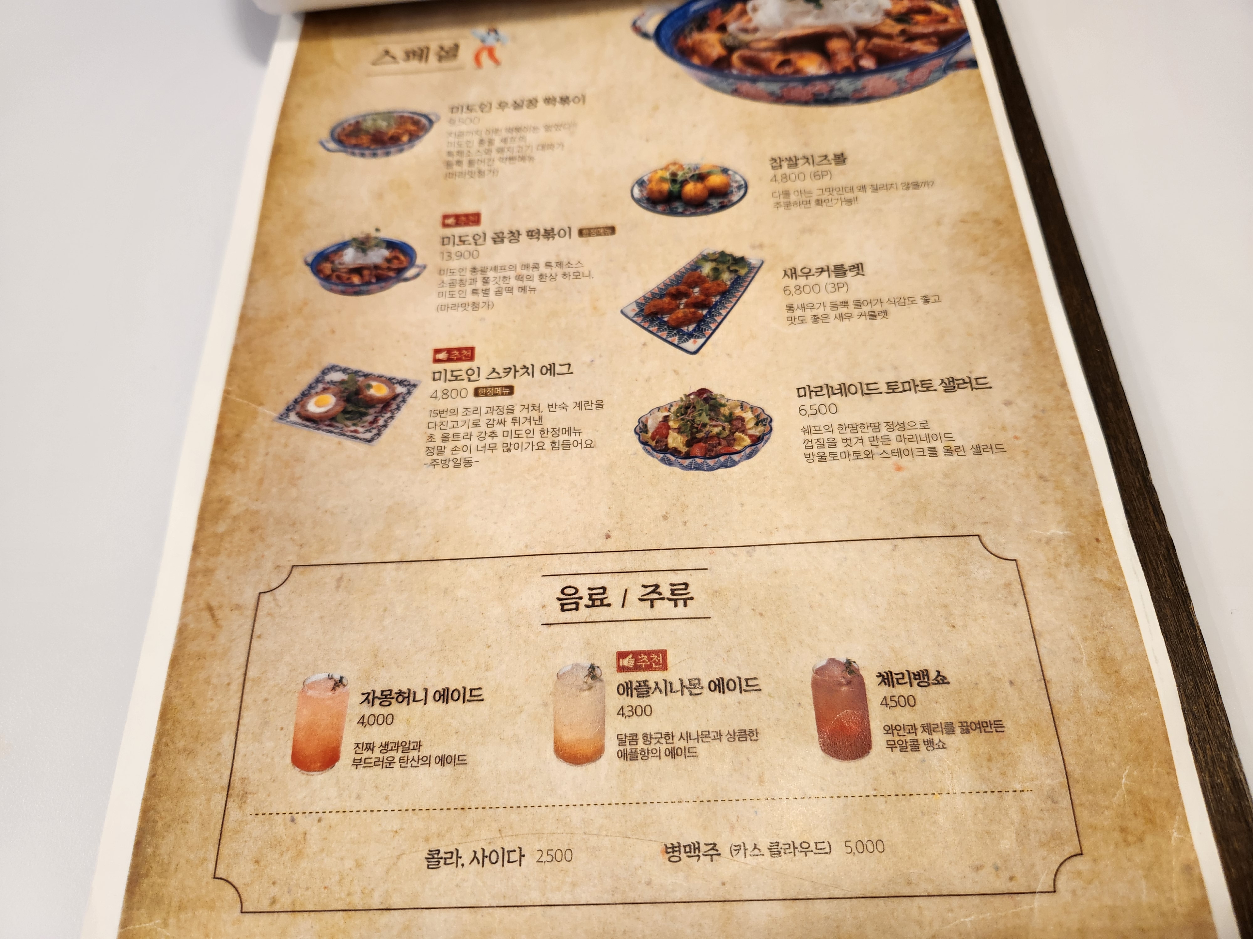 식당의 메뉴판이에요 스테이크 외에도 파스타와 여러 종류의 덮밥들을 판매하고 있어요 저희는 2명이서 밥을 먹으러 왔구요 주메뉴 2개와 음료 1개, 샐러드도 먹고 싶어서 토마토샐러드도 주문했어요