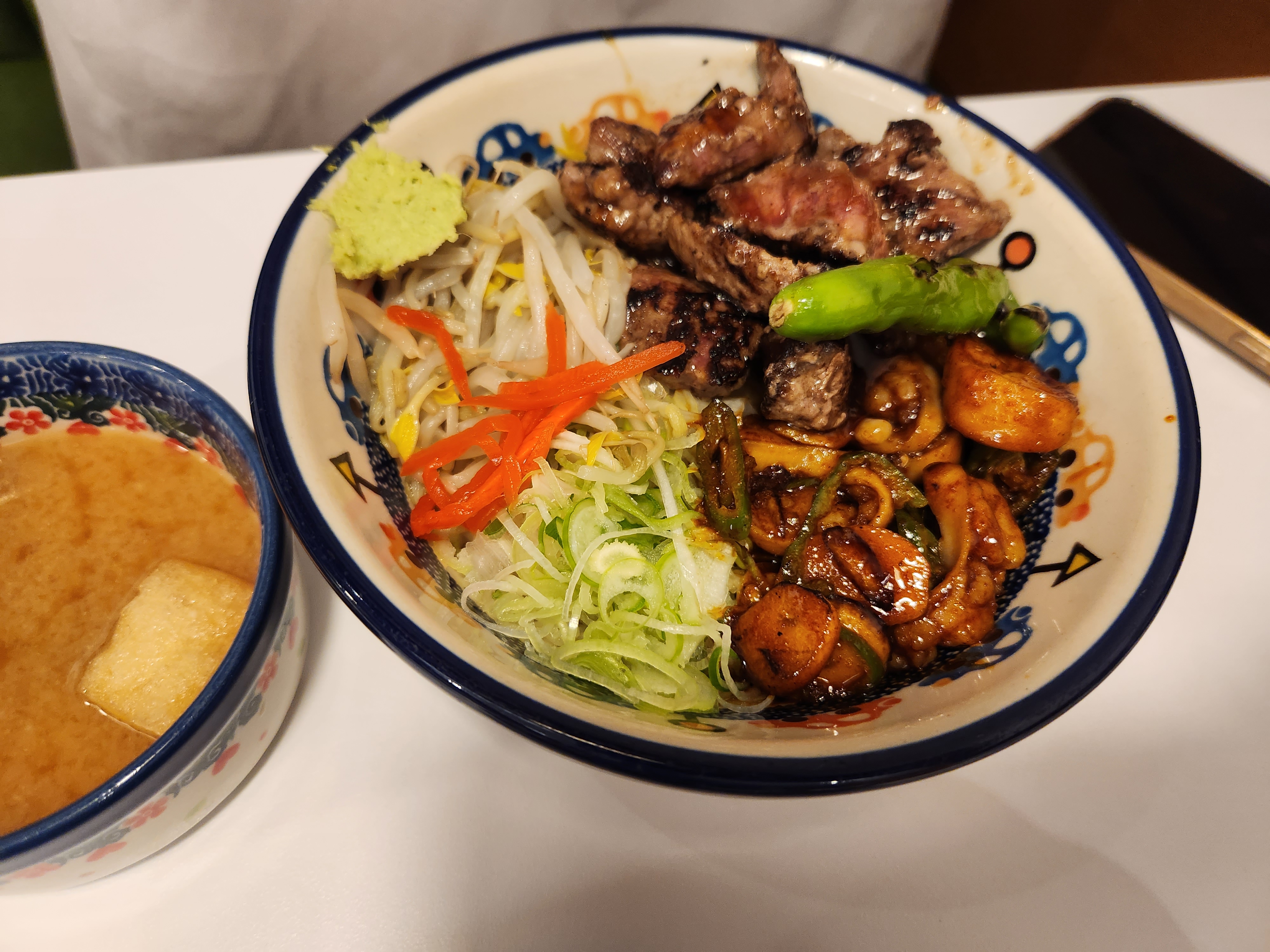 드디어 기다리던 메인 메뉴인 대창큐브스테이크덮밥이 나왔어요 전체적으로 맛을 괜찮았어요 대신 저 같은 경우는 좀 덜 짜게 먹는 편인데 제가 먹기에는 조금 짜서 밥을 추가로 더 달라고 해서 함께 먹으면 좋았을 것 같아요