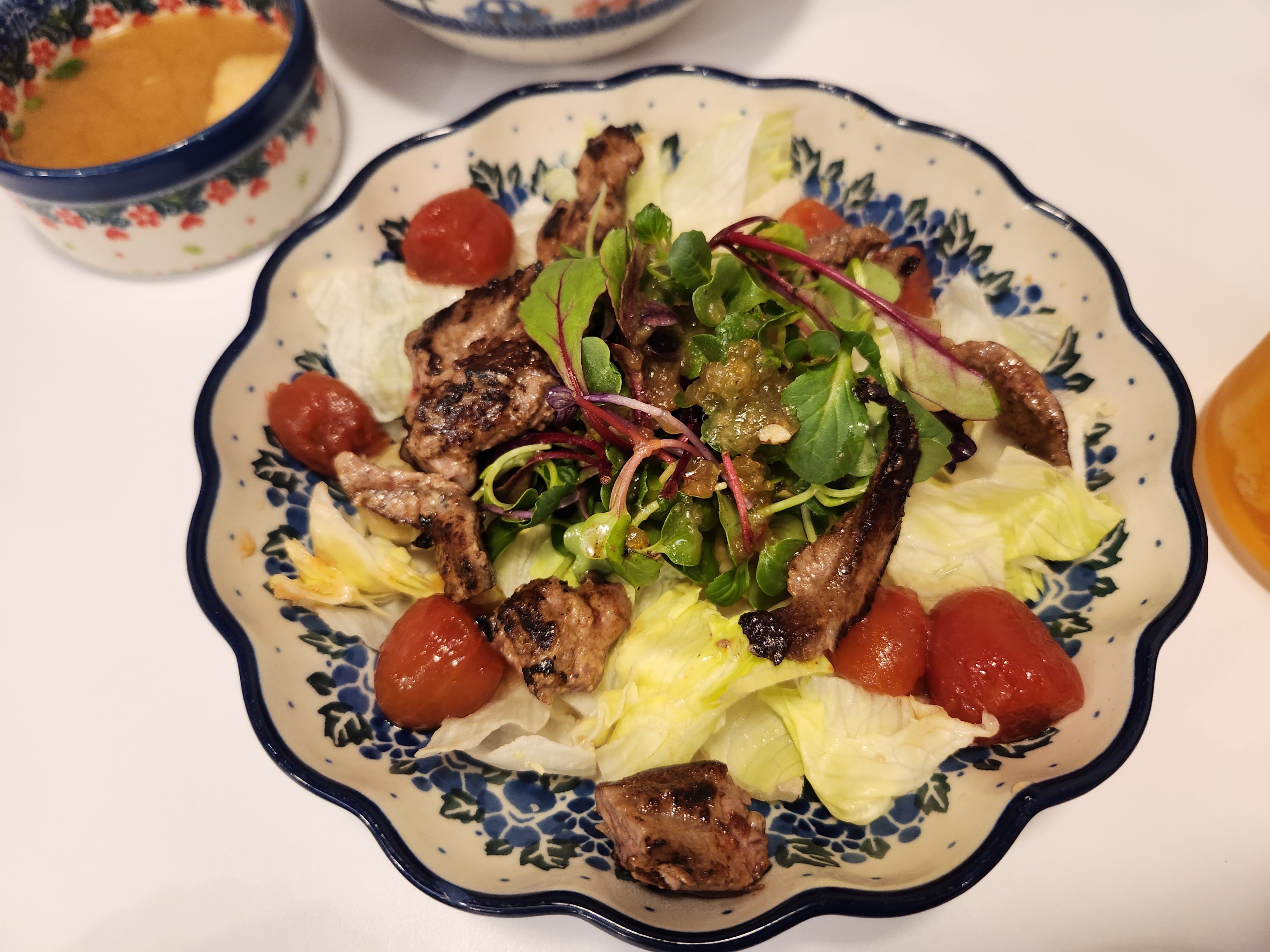 먼저 나온 기본 반찬들과 토마토 샐러드에요 토마토 샐러드인데 스테이크 고기가 들어 있었어요 역시 스테이크 맛집인가봐요 기본반찬들은 과하지 않게 정말 딱 필요한 것들만 나왔어요